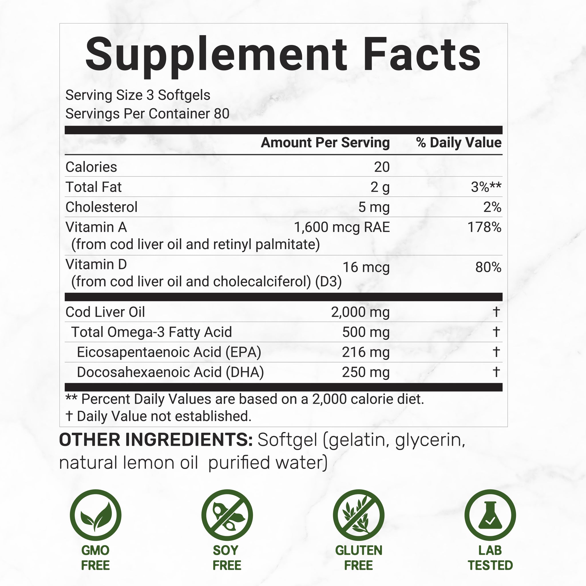 - Dosage & Servings – Each bottle provides 240 softgels, with a serving size of 3 softgels delivering 2,000mg of high-potency cod liver oil for an 80-day supply.