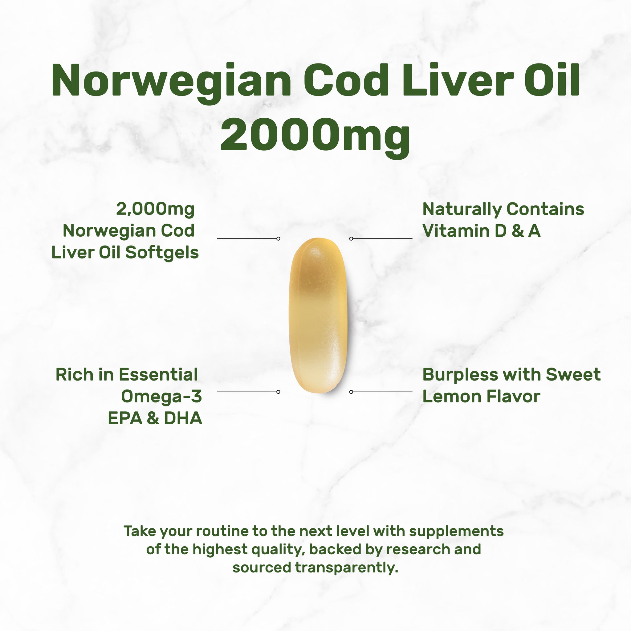 - Special Features – Extra strength cod liver oil softgels with 2,000mg per serving, sourced from wild-caught Norwegian cod fish to deliver a rich supply of DHA and EPA along with natural vitamin A and vitamin D3.