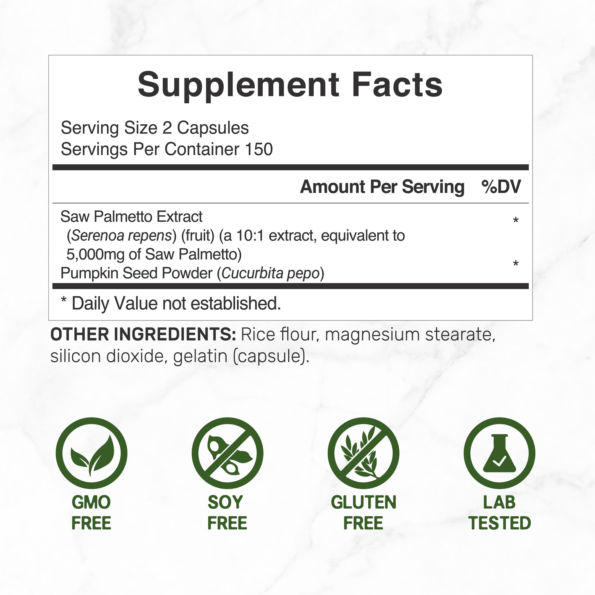 Dosage & Servings – 300 high concentrated capsules per bottle, 2 capsule serving size with 5,000mg saw palmetto 10:1 extract plus 50mg pumpkin seed powder, lasts up to 150 days.