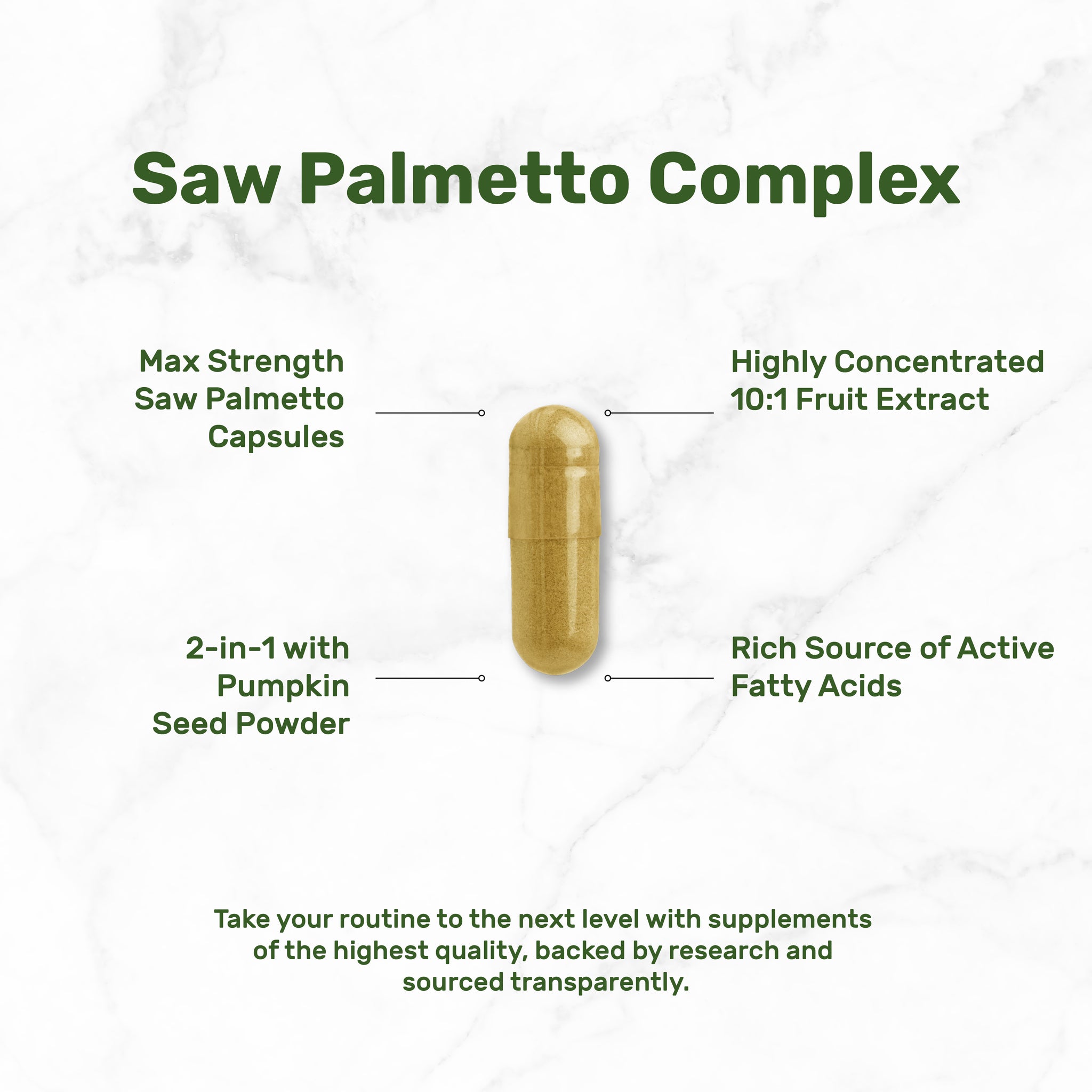 Special Features – Ultra strength 5,000mg saw palmetto complex, 10:1 potent extract with 45% fatty acids from saw palmetto berry powder, 2-in-1 capsuled formula with added pumpkin seed powder.